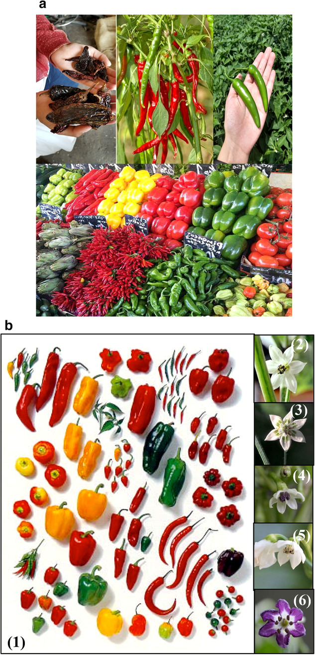 تنوع أنواع الفلفل. «أ» بعض الأنواع المختلفة من الفلفل الحار؛ «ب» جنس الفلفل المصنف حسب شكله وحجمه ولونه «1»، وأنواع مختلفة من الأزهار لكل من الفليفلة الحولية annuum في «2» والفليفلة العنيبية baccatum في «3» الفليفلة الصينية. chinense في «4» والفليفلة الشجيرية frutescens في «5» والفليفلة الوبرية pubescens في «6»