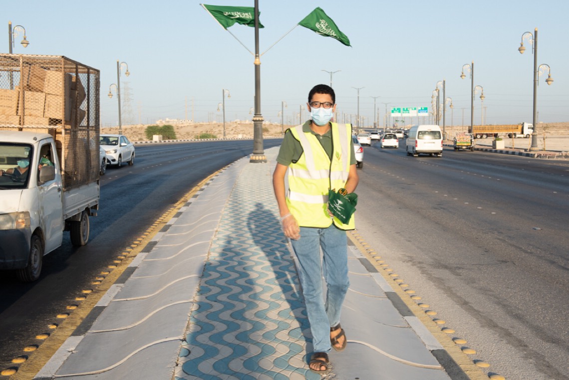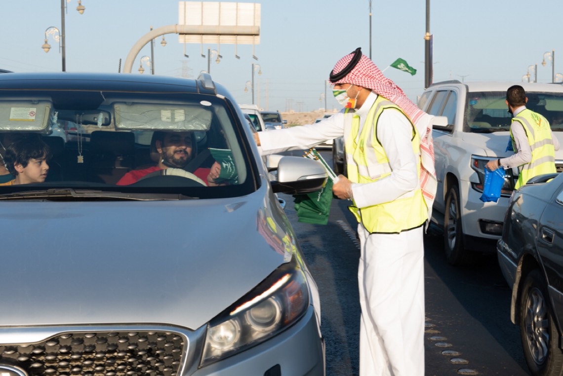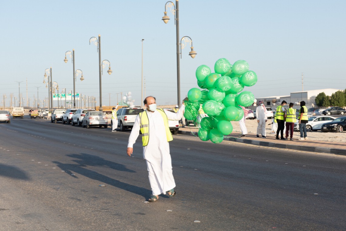 وحضر الإحتفال الذي نظمته لجنة التنمية الاجتماعية الأهلية بالأوجام أكثر من خمسين متطوعاً من الجنسين عند إشارات المرور بالقرب من كبري الأوجام وتبادلوا فيها التهاني وتوزيع الهدايا والورود وأعلام المملكة.