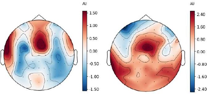 مخطط طوبوغرافي TOPOPLOTS للنصف الأول من مهمة جد «أوجد» علي الفروق «يسار» وآخر 250 مللي ثانية من مهمة ستروب Stroop «يمين» في نطاق ثيتا. المصدر: سبير: SPEER وآخرون، مجلة علم الأعصاب 2021