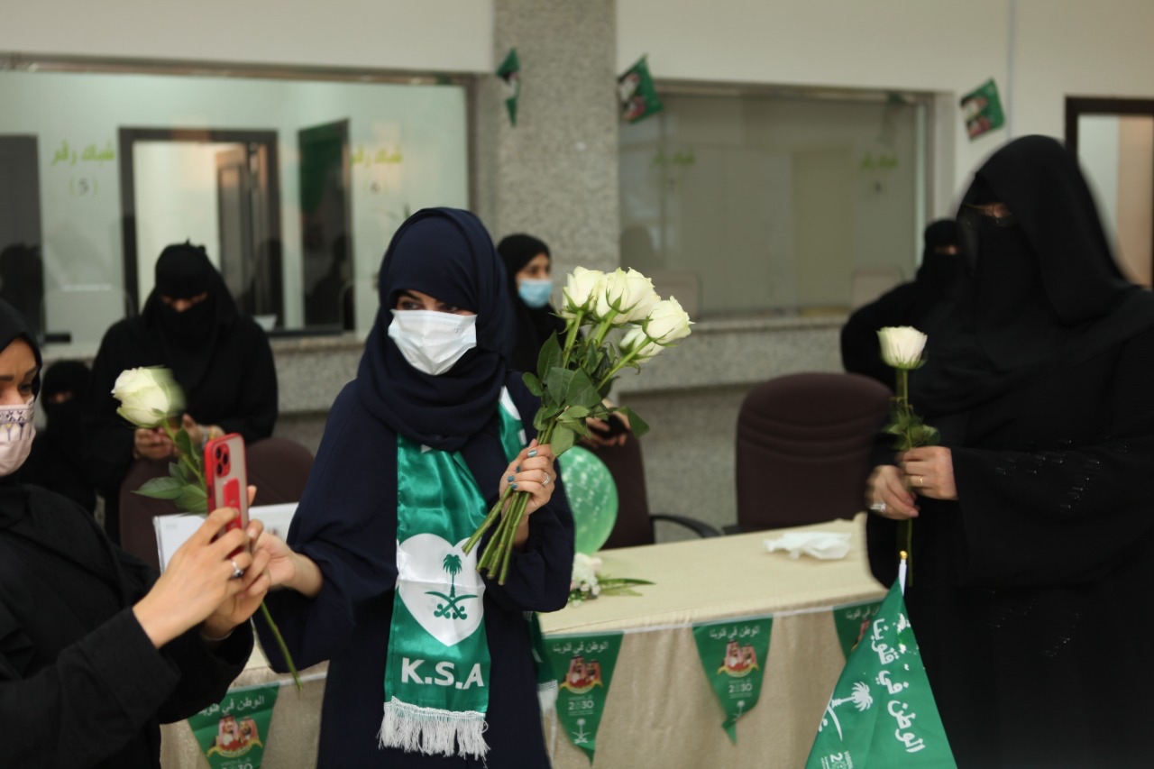 وتم توزيع الزهور والهدايا التذكارية والتي تحمل الشعارات الوطنية على الحضور في حينها كان لرئيسة القسم النسائي سمية عبدالوهاب مشاركة بقصيدة وطنية بعنوان ”هي لنا دار“، عبرت فيها عن حب الوطن والنجاحات التي تم تحقيقها بجنود هذا الوطن المعطاء حيث هنأت القيادة الرشيدة وكافة الشعب السعودي باليوم الوطني 91.