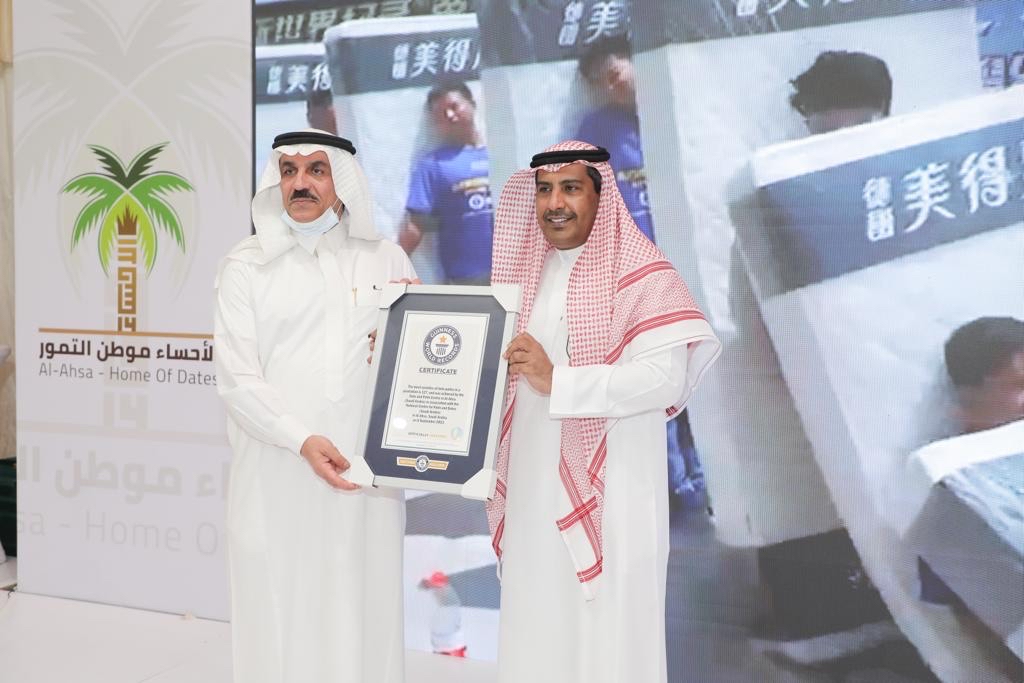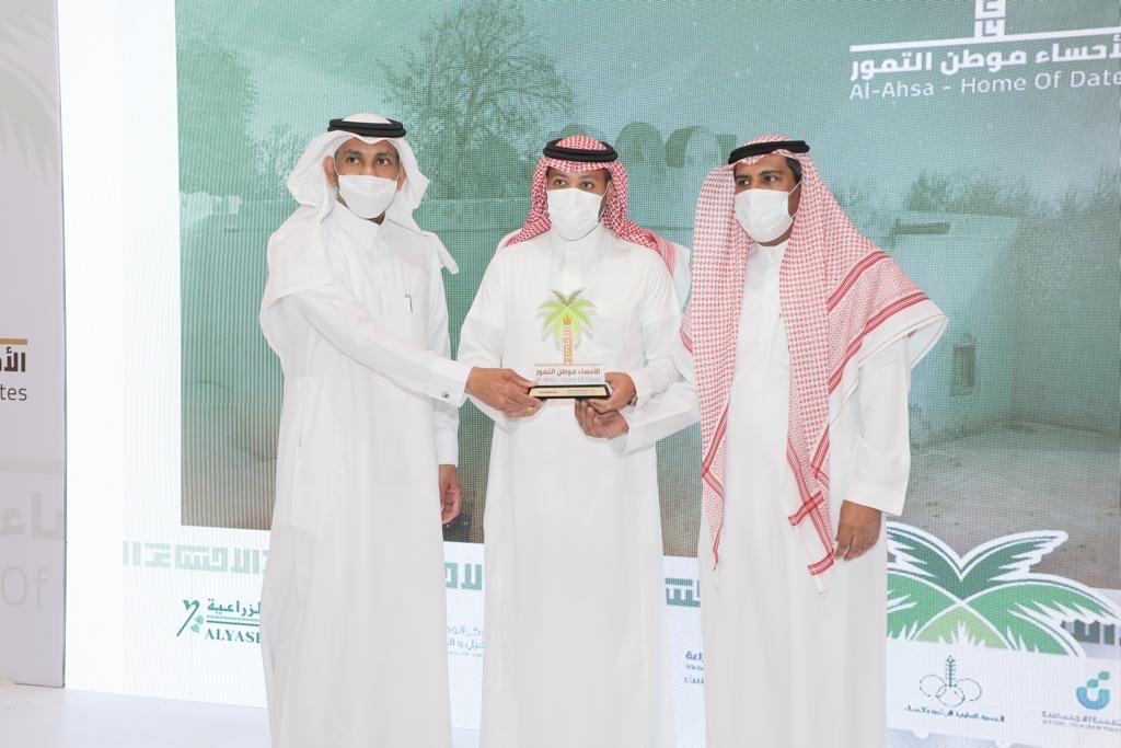 وجرى خلال حفل التدشين تكريم مركز أبحاث النخيل والتمور بمحافظة الأحساء لدخوله موسوعة غينيس للأرقام القياسية كأكبر بنك من نوعه في العالم ب 127 صنفاً من النخيل وطنية ودولية.