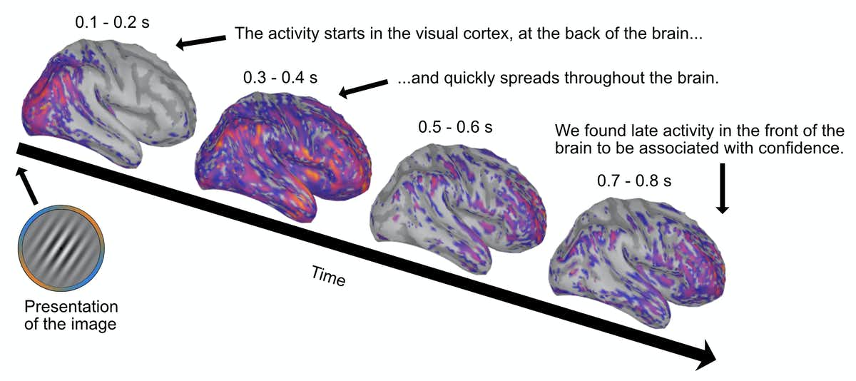 لقد وجدنا مؤخرًا طريقة للتمييز بين هاتين العمليتين[5] ، من خلال فصلهما في الوقت المناسب. في التجربة، قمنا بقياس نشاط أدمغة المشاركين أثناء اتخاذهم قرارات بشأن سلسلة كاملة من الصور المعروضة عليهم واحدة تلو الأخرى.