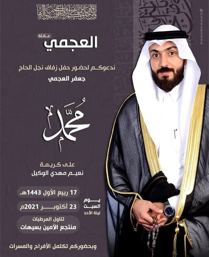 تحتفل عائلة العجمي والوكيل في سيهات مساء يوم السبت بزفاف الشاب محمد جعفر العجمي على كريم الحاج نعيم مهدي الوكيل في مناجع الأمين بسيهات وسط فرحة الأهل والأصدقاء ومحبي العريسين.