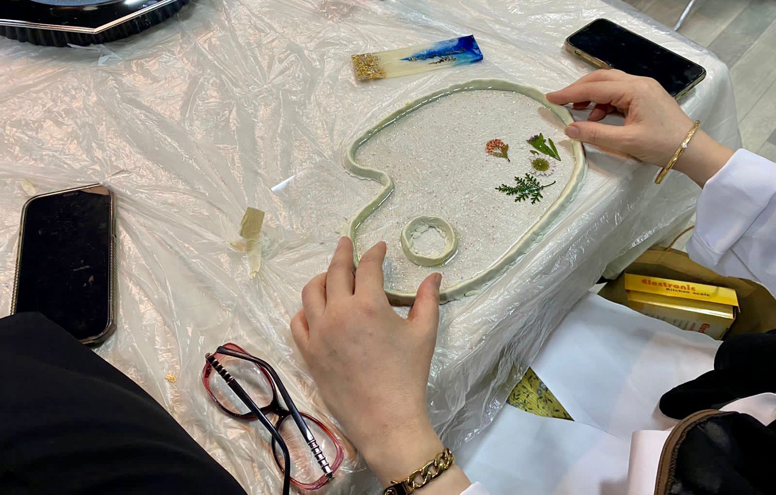 وأضافت وأيضا الكتابة على الريزن وطرق التشطيب والتنظيف والتوظيف للقطع الفنية للريزن بشكل جميل وجذاب.