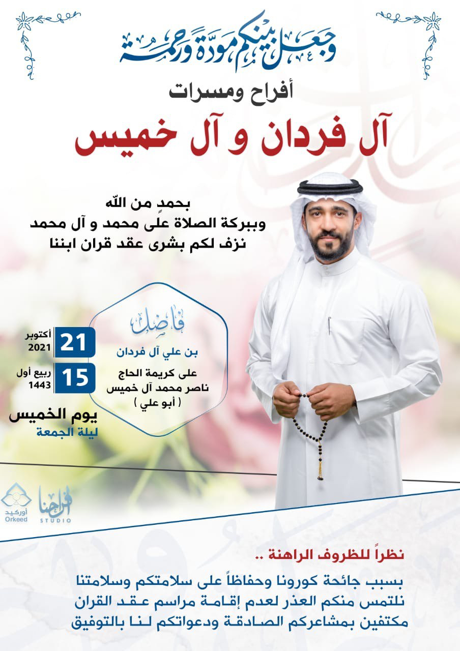 احتفلت عائلة آل فردان وآل خميس في صفوى مساء يوم الخميس بعقد قران الشاب فاضل علي آل فردان على كريمة الحاج ناصر محمد آل خميس وسط فرحة الأهل والأصدقاء ومحبي العريسين.