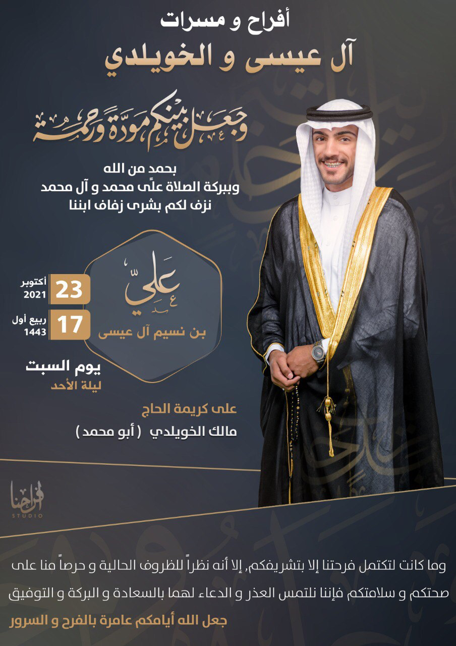 احتفلت عائلة آل عيسى والخويلدي في صفوى مساء يوم السبت بزفاف الشاب علي نسيم آل عيسى على كريمة الحاج مالك الخويلدي «أبو محمد» وسط فرحة الأهل والأصدقاء ومحبي العريسين.