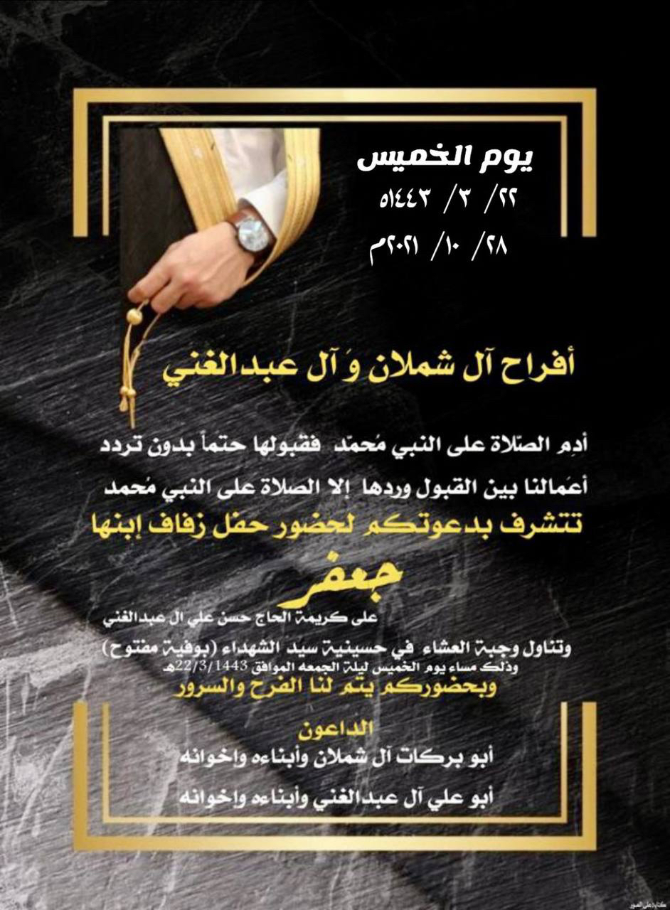 تحتفل عائلة آل شملان وآل عبد الغني في الخويلدية مساء يوم الخميس بزفاف الشاب جعفر آل شملان على كريمة الحاج حسن علي آل عبد الغني «أبو علي» وسط فرحة الأهل والأصدقاء ومحبي العريسين.