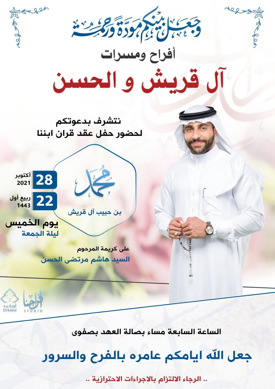 احتفلت عائلة آل قريش والحسن في صفوى مساء يوم الخميس بعقد قران الشاب محمد حبيب آل قريش على كريمة المرحوم السيد هاشم السيد مرتضى الحسن وسط فرحة الأهل والأصدقاء ومحبي العريسين.