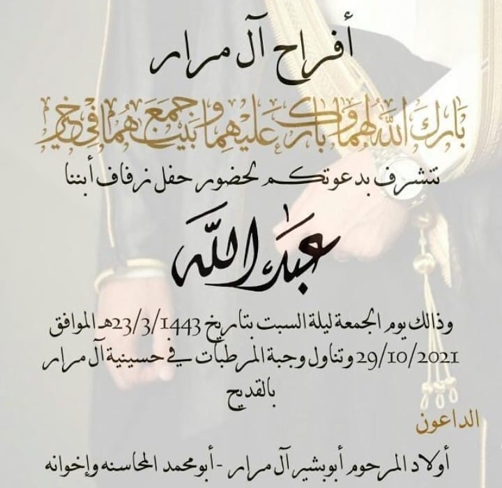 تحتفل عائلة آل مرار والمحاسنة في القديح مساء يوم الجمعة بزفاف الشاب عبدالله أحمد عبدالله آل مرار في حسينية آل مرار بالقديح وسط فرحة الأهل والأصدقاء ومحبي العريسين.
