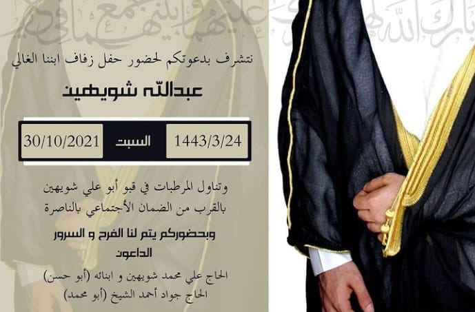 تحتفل عائلة شويهين والشيخ في القديح مساء يوم السبت بزفاف الشاب عبدالله علي محمد شويهين على كريمة الحاج جواد أحمد الشيخ «أبو محمد» وسط فرحة الأهل والأصدقاء ومحبي العريسين.