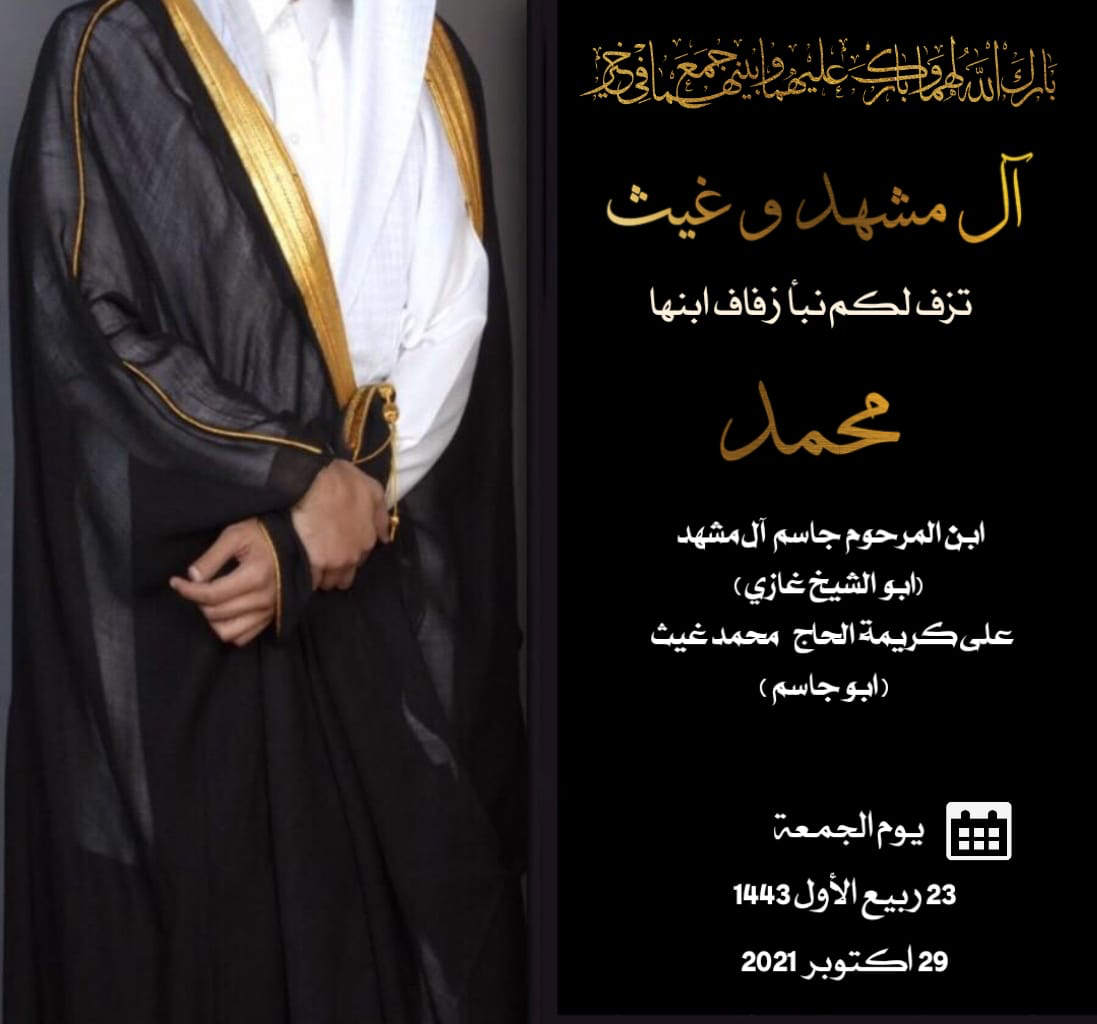 احتفلت آل مشهد وغيث في عنك والملاحة مساء يوم الجمعة بزفاف الشاب محمد جاسم آل مشهد على كريمة الحاج محمد غيث «أبو جاسم» وسط فرحة الأهل والأصدقاء ومحبي العريسين.