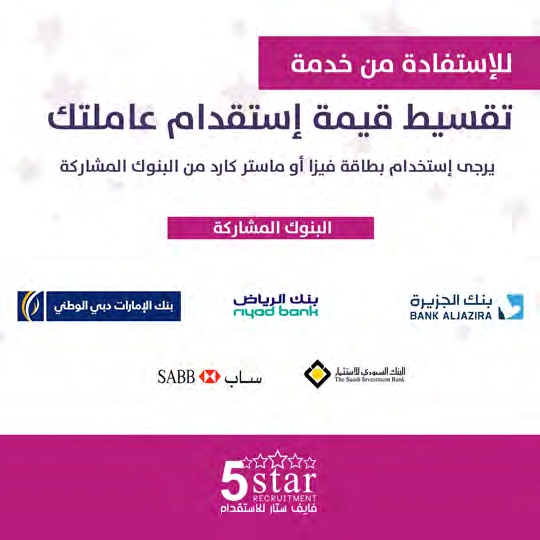 الآن بإمكانك تقسيط تكلفة استقدام عاملتك من ”فايف ستار“ والدفع الإلكتروني عبر منصة مساند.