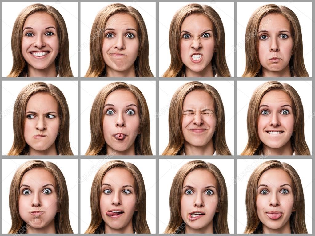 Multiple close-up portraits of the same woman expressing different emotions isolated on white — Photo by kotin