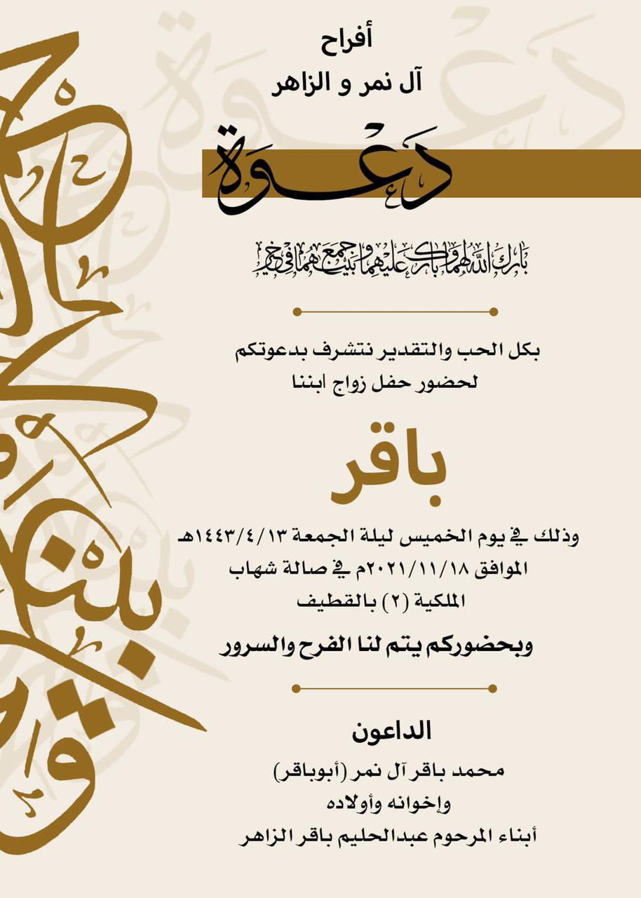 احتفلت عائلة آل نمر والزاهر في العوامية مساء يوم الخميس بزفاف الشاب باقر آل نمر نجل الكاتب محمد باقر آل نمر على كريمة المرحوم عبد الحليم باقر الزاهر في صالة شهاب الملكية وسط فرحة الأهل والأصدقاء ومحبي العريسين.