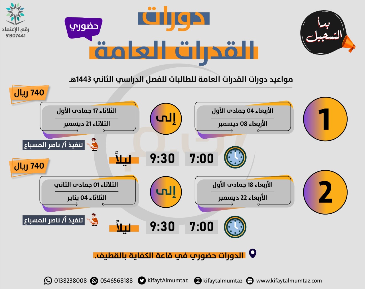 مركز مبدأ كفاية الممتاز للتدريب يعلن عن بدء التسجيل في دورات القدرات العامة للفصل الدراسي الثاني بإشراف الأستاذ ناصر المسباع
