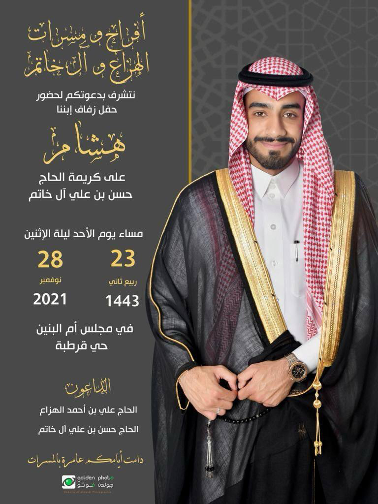 تحتفل عائلة الهزاع وآل خاتم في سيهات مساء يوم الأحد بزفاف الشاب هشام علي أحمد الهزاع على كريمة الحاج حسين علي آل خاتم في مجلس أم البنين حي قرطبة بسيهات وسط فرحة الأهل والأصدقاء ومحبي العريسين.