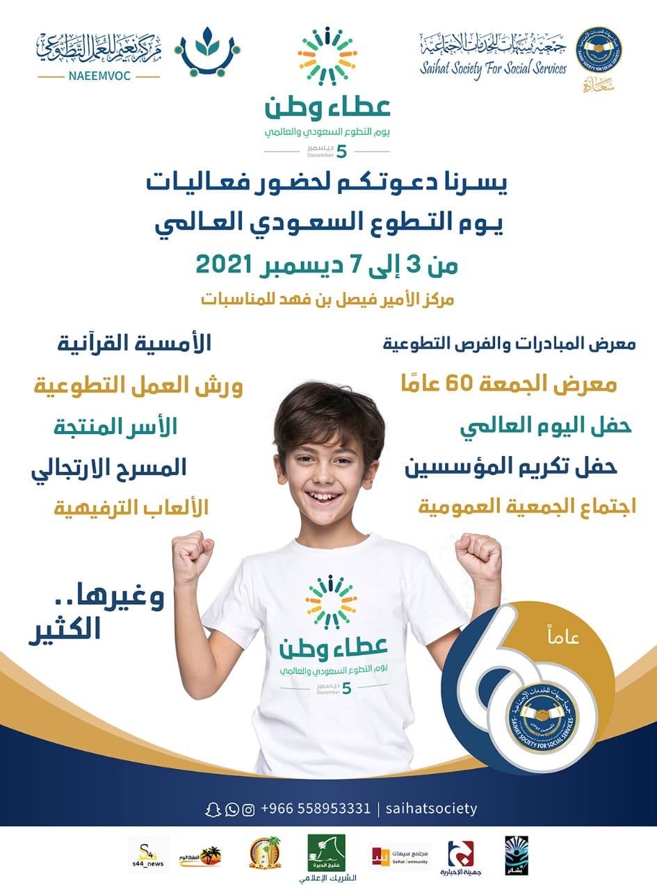 يستعد مركز نعيم للعمل التطوعي التابع لجمعية سيهات للخدمات الاجتماعية للاحتفال بيوم التطوع السعودي والعالمي 2021 تحت شعار 60 عاماً من العطاء وذلك في مركز الأمير فيصل بن فهد للمناسبات.