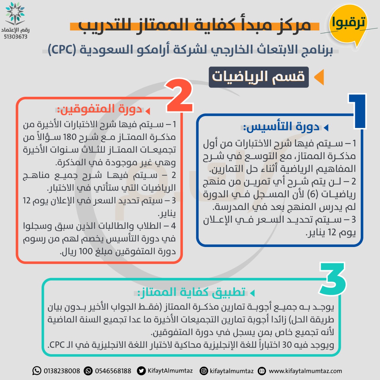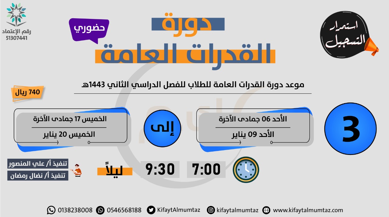 مركز مبدأ كفاية الممتاز للتدريب يعلن عن بدء التسجيل في دورات القدرات العامة للفصل الدراسي الثاني بإشراف الأستاذ ناصر المسباع .
