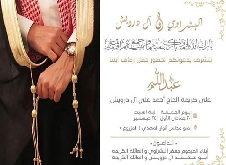 تحتفل عائلة البشراوي وآل درويش مساء يوم الجمعة بزفاف الشاب عبدالله جعفر البشراوي على كريمة الحاج أحمد علي آل درويش في مجلس أنوار المهدي بالمزروع وسط فرحة الأهل والأصدقاء ومحبي العريسين.
