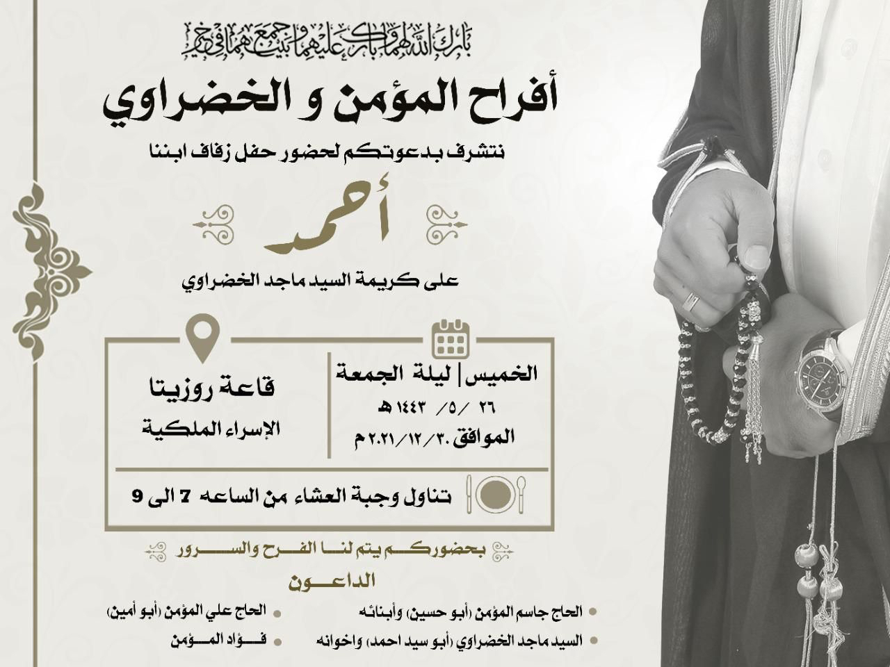 تحتفل عائلة المؤمن والخضراوي في عنك «حي العليوات» مساء يوم الخميس بزفاف الشاب أحمد جاسم المؤمن على كريمة السيد ماجد الخضراوي في قاعة رؤيتنا - الإسراء الملكية وسط فرحة الأهل والأصدقاء ومحبي العريسين.