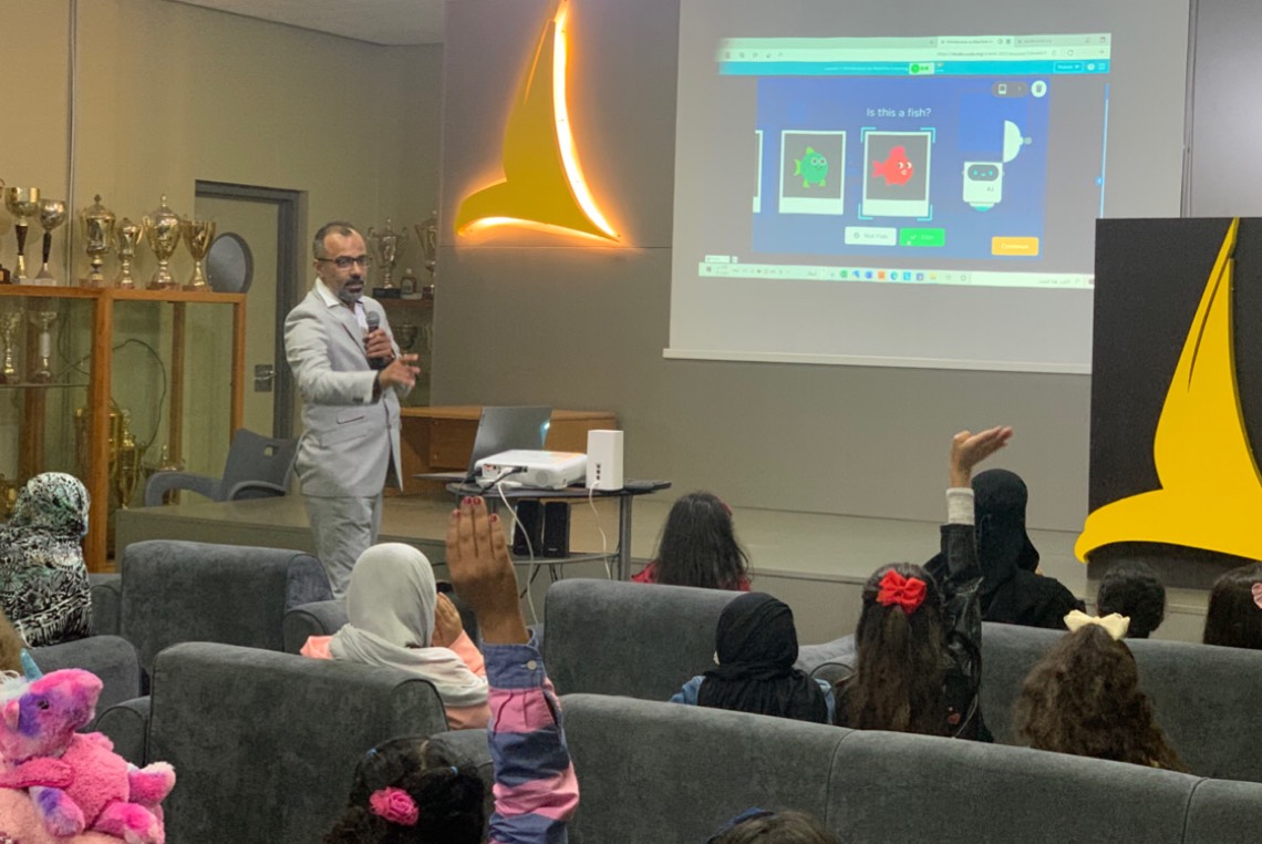 وأشار ألى أنه قام بتطبيق نشاط فعلي وتدريب وهو تطوير رجل الي يساعد في تنظيف البحر من النفايات، بشكل تفاعلي يوضح لهم معنى الذكاء الاصطناعي بالبيانات المدرجة والتصنيف.