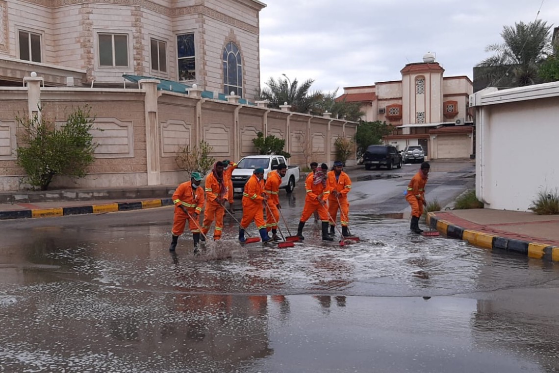 من ناحيته، أوضح رئيس البلدية م. محمد بن الحسيني أنه فور هطول الأمطار الغزيرة على المحافظة باشرت فرق الطوارئ وإداراتها المختصة تنفيذ خطة الأمطار المعتمدة، والتي من خلالها تم تقسيم المحافظة لأربعة مناطق، واستقبال البلاغات عبر مركز الطوارئ على مدار 24 ساعة، وتوزيع 486 من القوى العاملة ما بين مشرفين وفنيين وسائقين، و80 معدة ومضخة على تلك المناطق؛ لسحب ونزح تجمعات مياه الأمطار في المواقع غير المخدومة بشبكات تصريف مياه الأمطار.