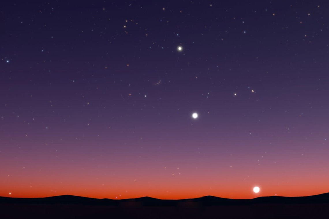 هلال القمر سيكون هذه الليلة في حالة اقتران مع كوكب عطارد «-0,7» وكلاهما موجود في كوكبة الجدي، وستكون المسافة الظاهرية بينهما 3 درجات، وهي واسعة ليشاهدا سويا في مجال رؤية التلسكوب ولكن يمكن ذلك باستخدام المنظار.