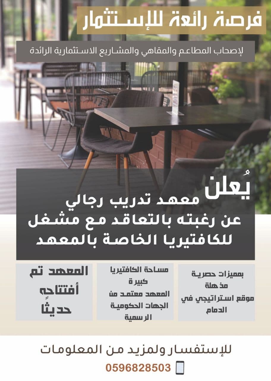 يعلن معهد تدريب عالي للرجال بالدمام عن رغبته بالتعاقد مع مستأجر ومشغل للكافتيريا .