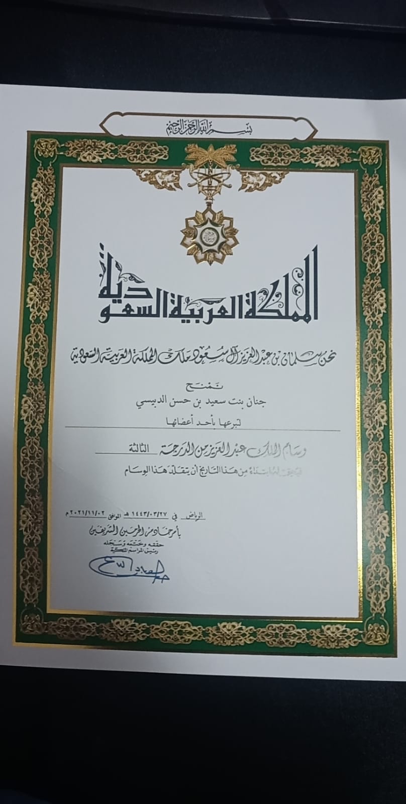 وتم تكريم ”الدبيسي“، وحصولها على وسام الملك عبدالعزيز من الدرجة الثالثة نظير التبرع بخلاياها الجذعية لعلاج اختها المصابة بفقر الدم المنجلي.