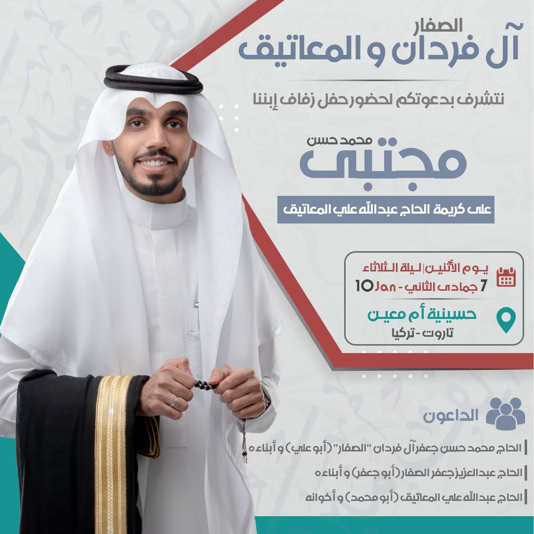 احتفلت عائلة آل فردان والمعاتيق في تاروت مساء يوم الإثنين بزفاف الشاب مجتبى محمد حسن جعفر آل فردان «الصفار» على كريمة الحاج عبدالله علي المعاتيق «أبو محمد» في حسينية أم معين بحي التركيا بجزيرة تاروت وسط فرحة الأهل والأصدقاء ومحبي العريسين.