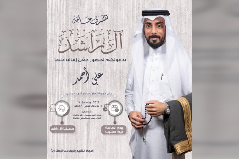 تحتفل عائلة آل راشد والجشي مساء يوم الجمعة بزفاف الشاب علي أحمد محمد آل راشد على كريمة الحاج جعفر أحمد الجشي في حسينية آل راشد وسط فرحة الأهل والأصدقاء ومحبي العريسين.