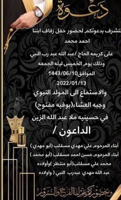 تحتفل عائلة مسقلب والعبدالنبي في القديح مساء يوم الخميس بزفاف الشاب أحمد محمد مسقلب على كريمة الحاج عبدالله مهدي العبد النبي في حسينية ملا عبدالله الزين بالقديح وسط فرحة الأهل والأصدقاء ومحبي العريسين.