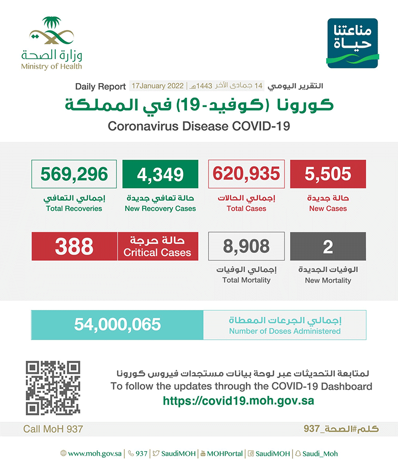 كما أعلنت الصحة عن تسجيل ”4349“ حالة تماثلت للشفاء، ليصل مجموع المتعافين إلى ”569296“ حالة تعافي، فيما ارتفع إجمالي الوفيات في المملكة إلى ”8908“ حالة بعد تسجيل ”2“ حالة وفاة جديدة.