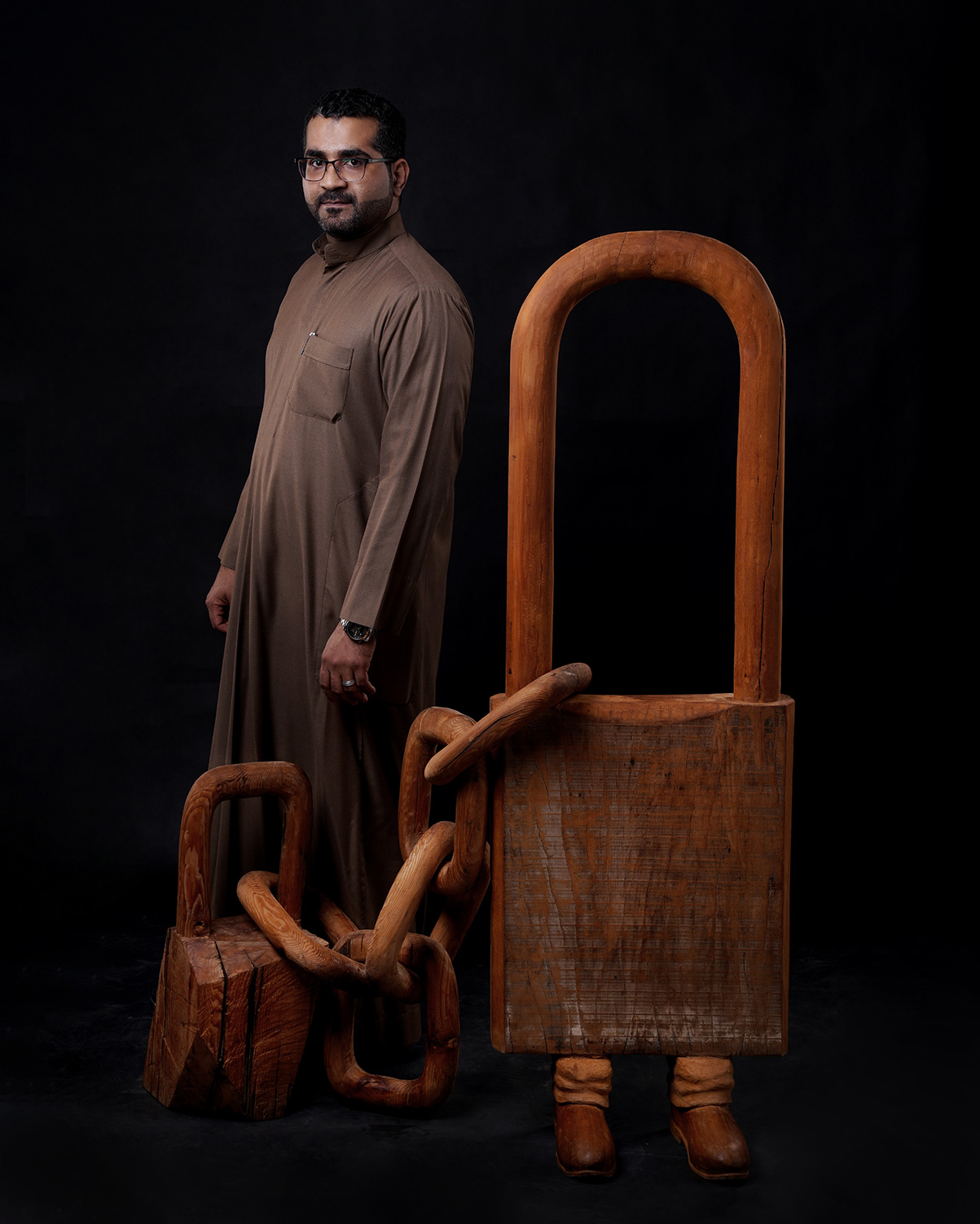 والمنحوتة عبارة عن قفل خشبي بطول إنسان يقف على قدمين بشريتين وهو مكبل بسلسلة مثبتة في كتلة خشبية ثقيلة.