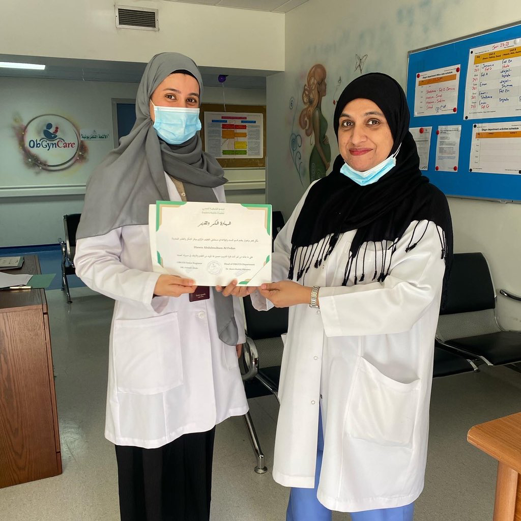 وشاركت الحفل رئيسة قسم النساء والولادة الدكتورة ريم الدوسري ومسؤولة قسم الامتياز الدكتورة فاطمة الزين.