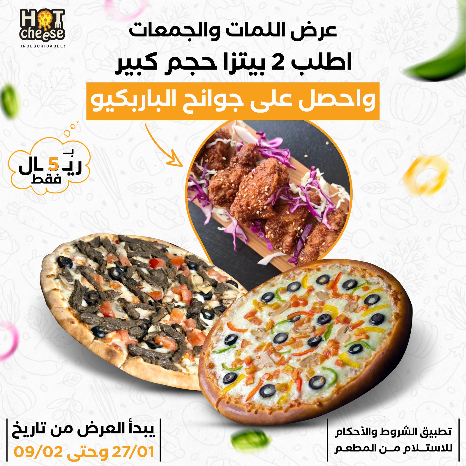 أطلب 2 بيتزا حجم كبير ”أي نوع“ من هوت تشيز وأحصل على وجبة جوانح الباربكيو بـ 5 ريال فقط.