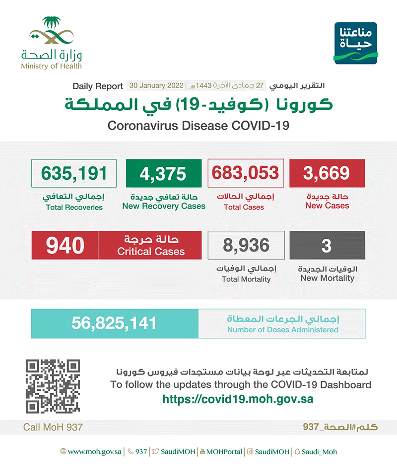 كما أعلنت الصحة عن تسجيل ”4,375“ حالة تماثلت للشفاء، ليصل مجموع المتعافين إلى ”635,191“ حالة تعافي، فيما ارتفع إجمالي الوفيات في المملكة إلى ”8,936“ حالة بعد تسجيل ”3“ حالة وفاة جديدة.