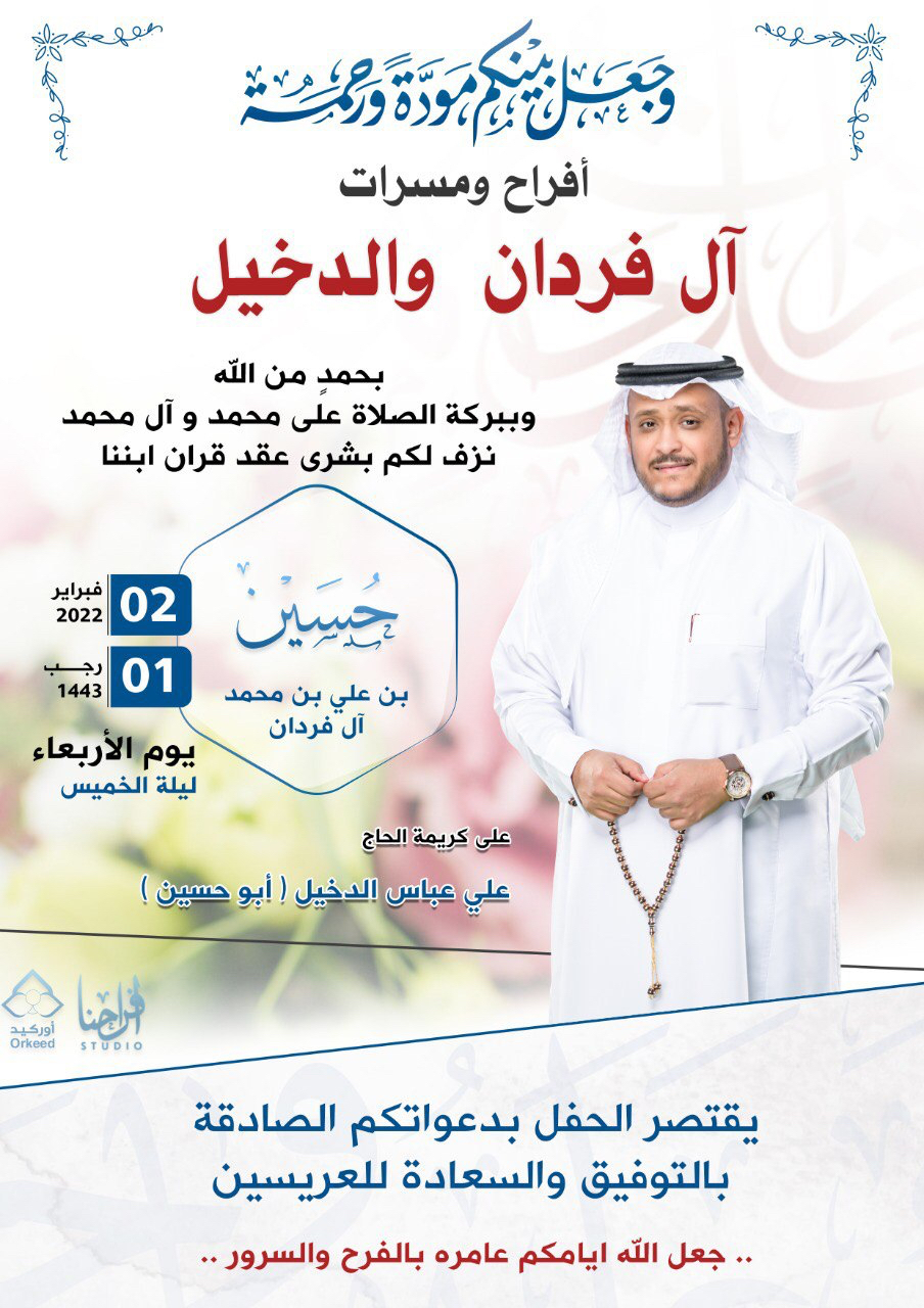 احتفلت عائلة آل فردان والدخيل في صفوى مساء يوم الأربعاء بعقد قران الشاب حسين علي محمد آل فردان على كريمة الحاج علي عباس الدخيل «أبو حسين» وسط فرحة الأهل والأصدقاء ومحبي العريسين.