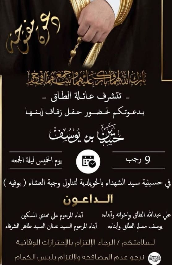 تحتفل عائلة الطاق في الخويلدية مساء يوم الخميس بزفاف الشاب حسين يوسف الطاق في حسينية الشهداء بالخويلدية وسط فرحة الأهل والأصدقاء ومحبي العريسين.
