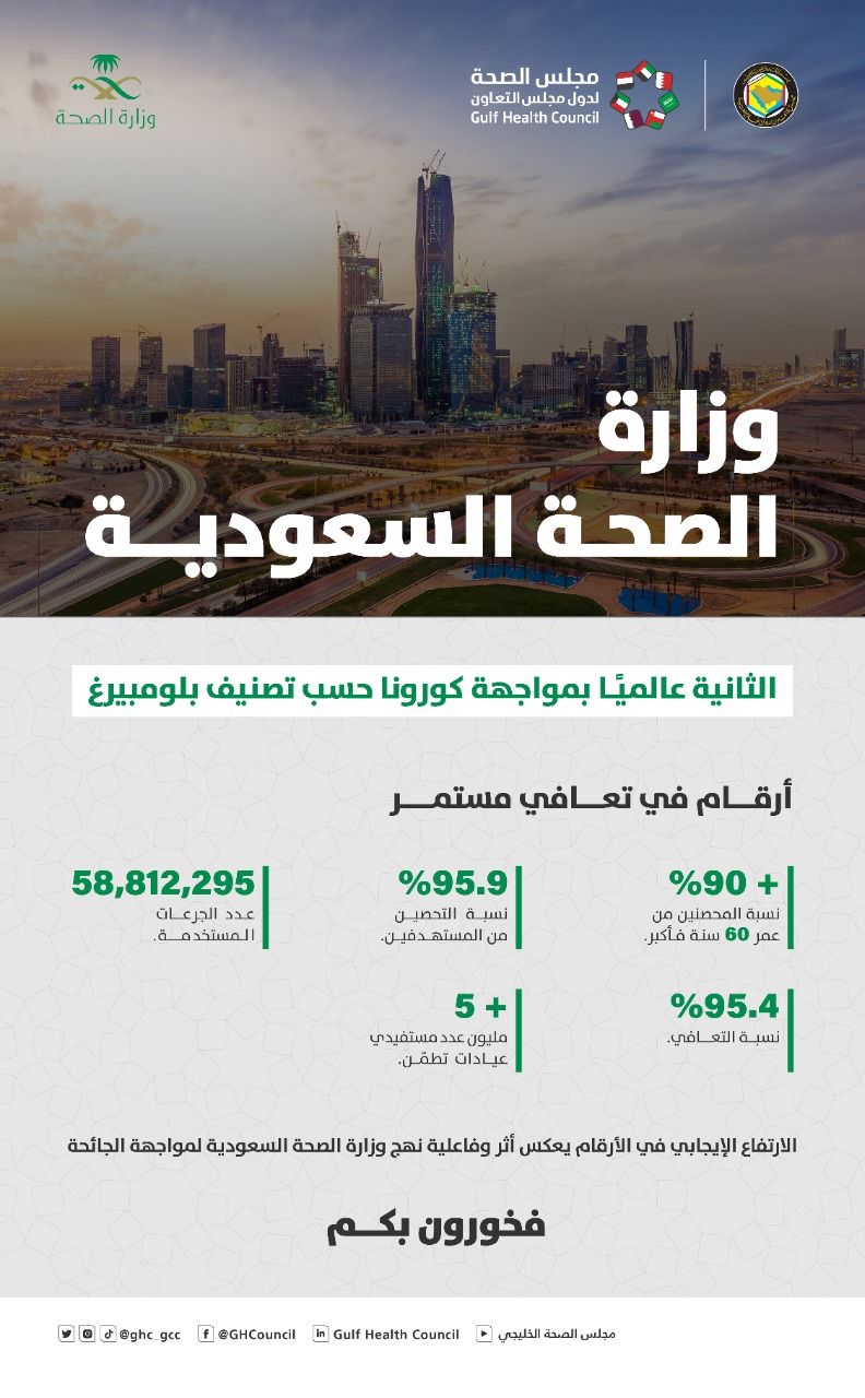واستطاعت الصحة في المملكة العربية السعودية الوصول على مايزيد عن نسبة 90% في تحصين الفئة العمرية من 60 سنة فأكثر، والوصول إلى نسبة 95,9% في رقم التحصين المستهدف، ووصول نسبة التعافي من المصابين بفايروس كورونا مانسبته 95,4%.
