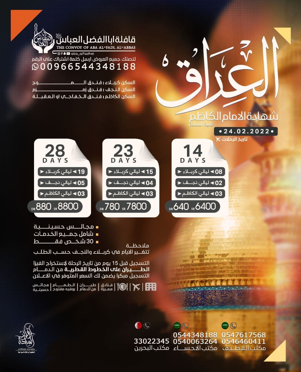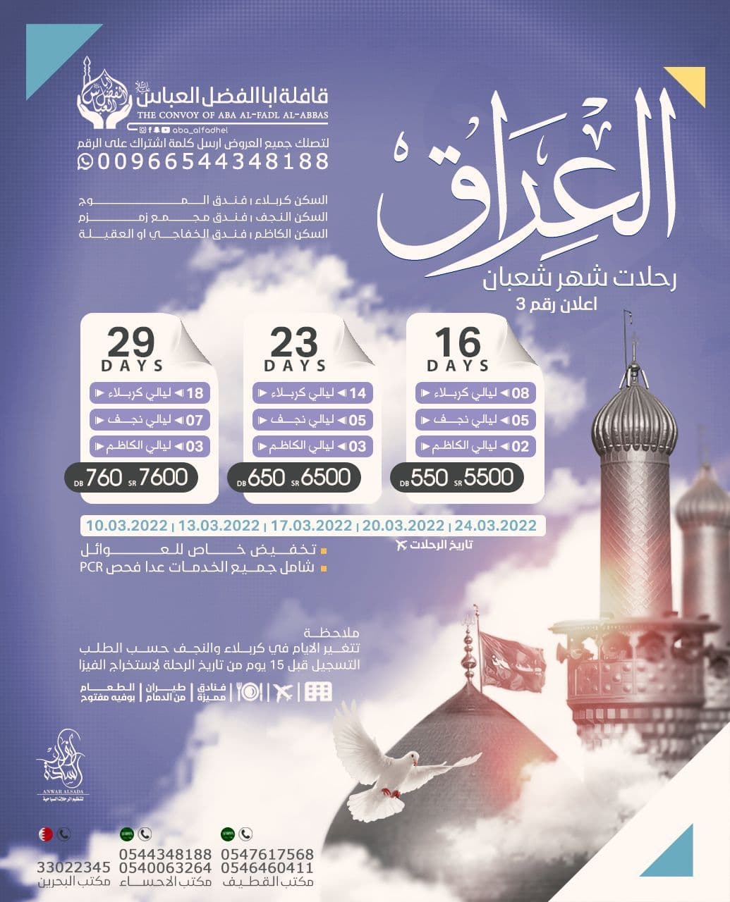 تعلن قافلة أبا الفضل العباس ومكتب أنوار السادة للسفر والسياحة عن رحلاتها لشهر شعبان