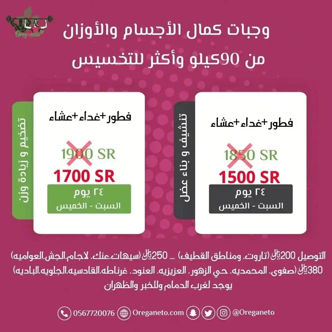 3 وجبات وسلطة وسناك و”توصيل مجاني“ للراغبين في التخسيس ومرضى السكري والحوامل والمرضعات بإشراف إخصائية تغذية.