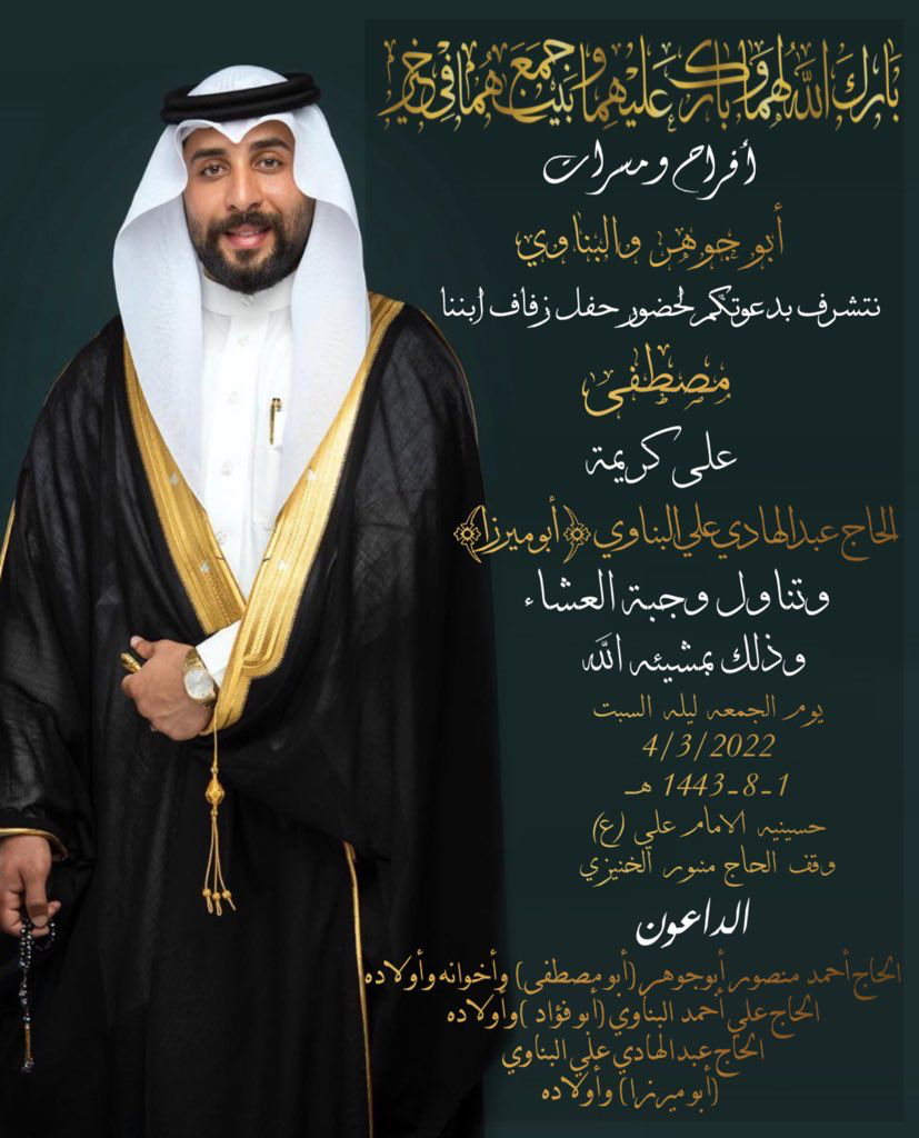 تحتفل عائلة أبو جوهر والبناوي في العوامية مساء يوم الجمعة 1شعبان بزفاف الشاب مصطفى أحمد منصور أبو جوهر على كريمة الحاج عبد الهادي علي أحمد البناوي «أبو ميرزا» في حسينية الإمام علي وقف الحاج منصور الخنيزي مقابل ملاعب نادي السلام بالعوامية وسط فرحة الأهل والأصدقاء ومحبي العريسين.
