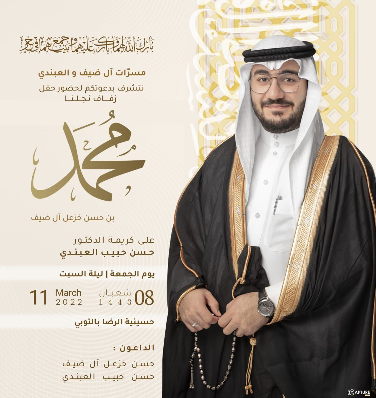 تحتفل عائلة آل ضيف والعبندي في التوبي مساء يوم الجمعة 8 شعبان بزفاف الشاب محمد حسن خزعل آل ضيف على كريمة الدكتور حسن حبيب العبندي في حسينية الرضا بالتوبي وسط فرحة الأهل والأصدقاء ومحبي العريسين.
