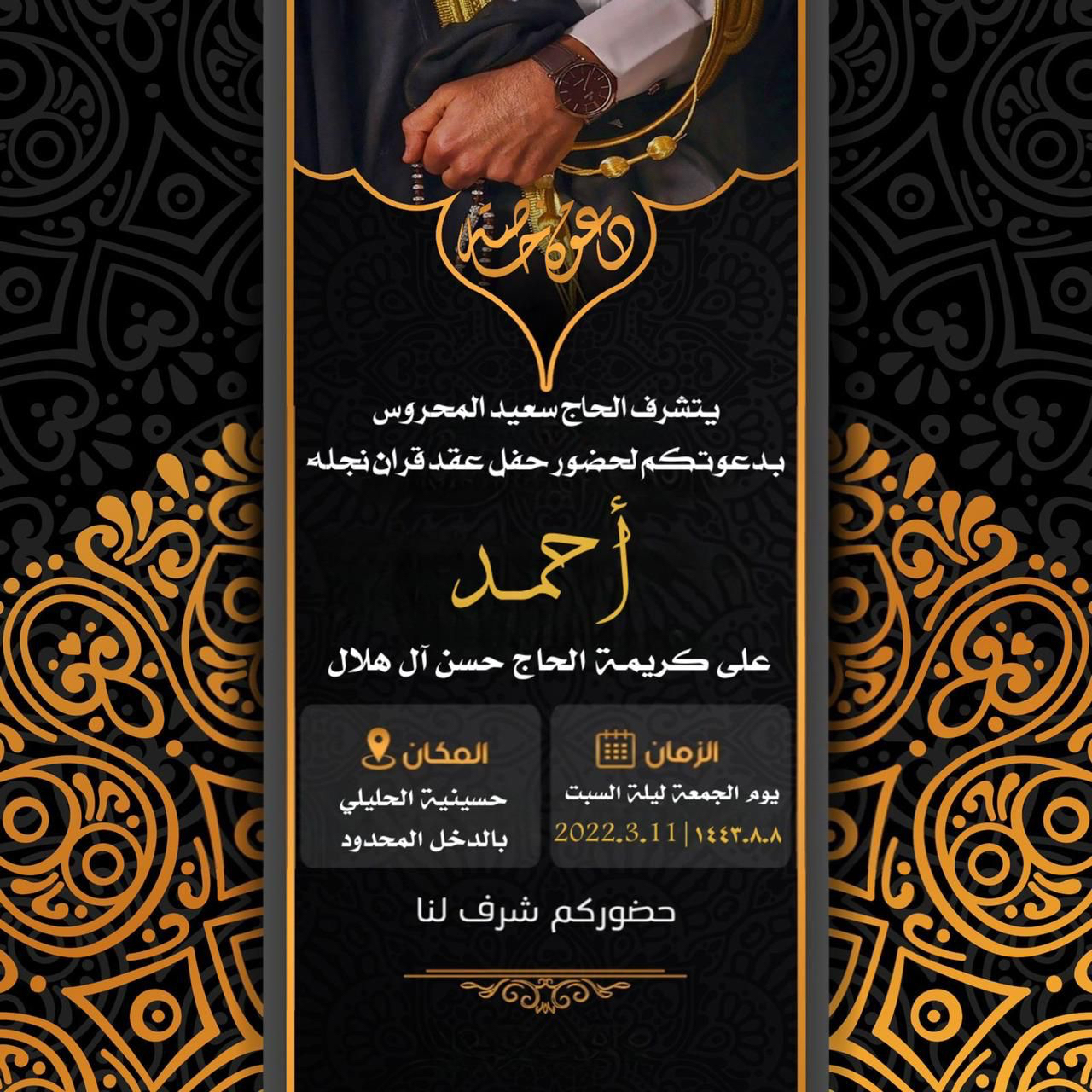 احتفلت عائلة المحروس وآل هلال في القطيف «حي الدخل المحدود» مساء يوم الجمعة 8 شعبان بعقد قران الكابتن أحمد سعيد المحروس لاعب كرة القدم بنادي الصفا الرياضي، على كريمة الحاج حسن آل هلال في حسينية الحليلي بالدخل المحدود وسط فرحة الأهل والأصدقاء ومحبي العريسين.