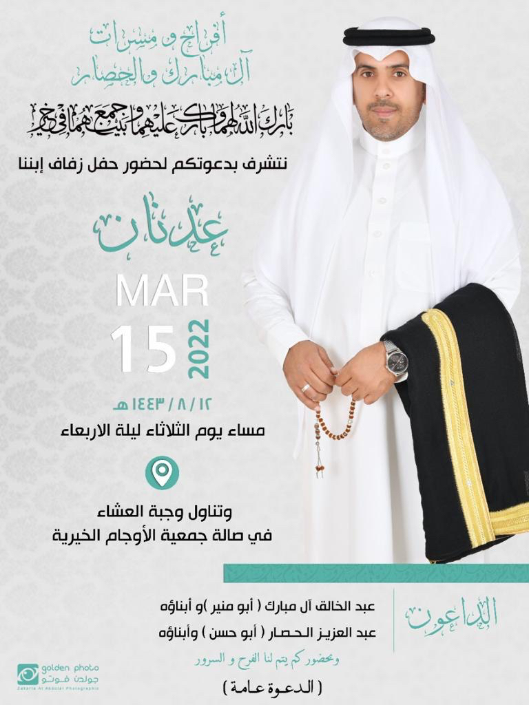 احتفلت عائلة آل مبارك والحصار في الأوجام مساء يوم الثلاثاء 12 شعبان بزفاف الشاب عدنان عبد الخالق آل مبارك على كريمة الحاج عبد العزيز الحصار «أبو حسن» في صالة جمعية الأوجام الخيرية وسط فرحة الأهل والأصدقاء ومحبي العريسين.
