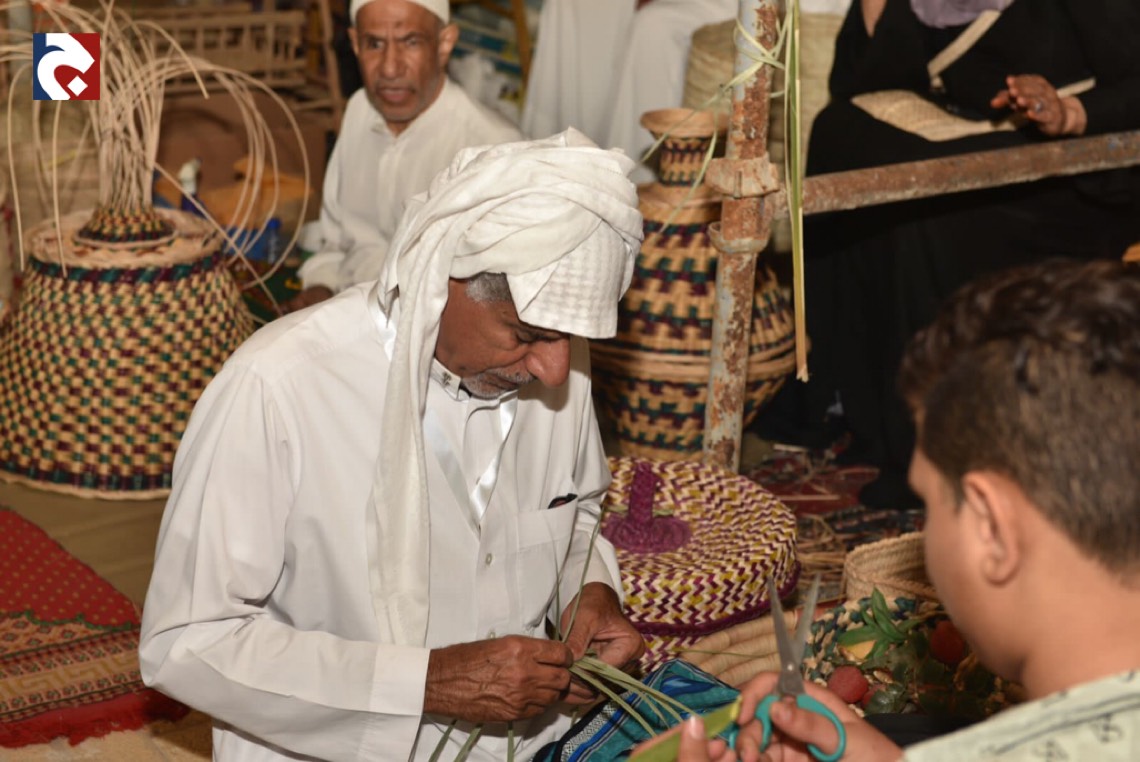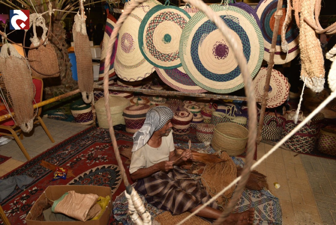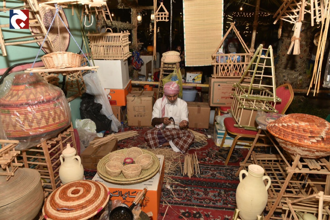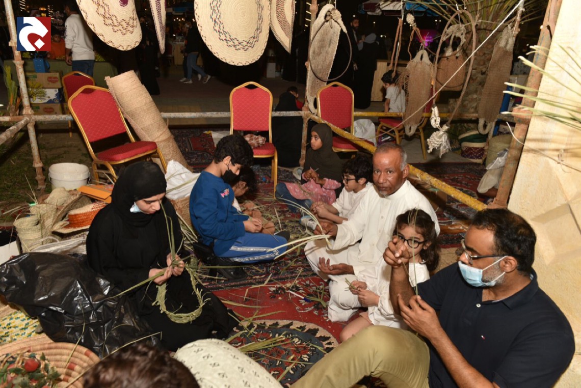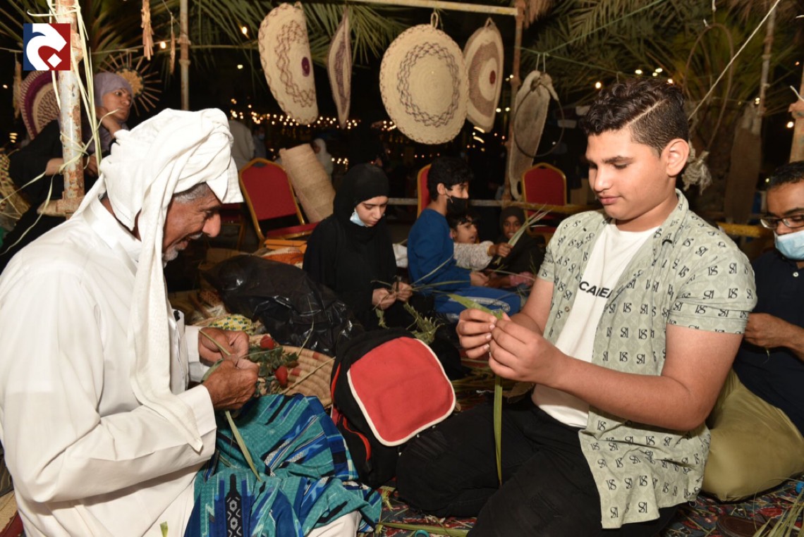 في أكثر من ركن ملتقى ”البراحة3”يجدُ الزائرون محطات ل“ سف خوص النخيل" في منظر جاذب يُدرب فيه الحرفيون الصغار عليها.