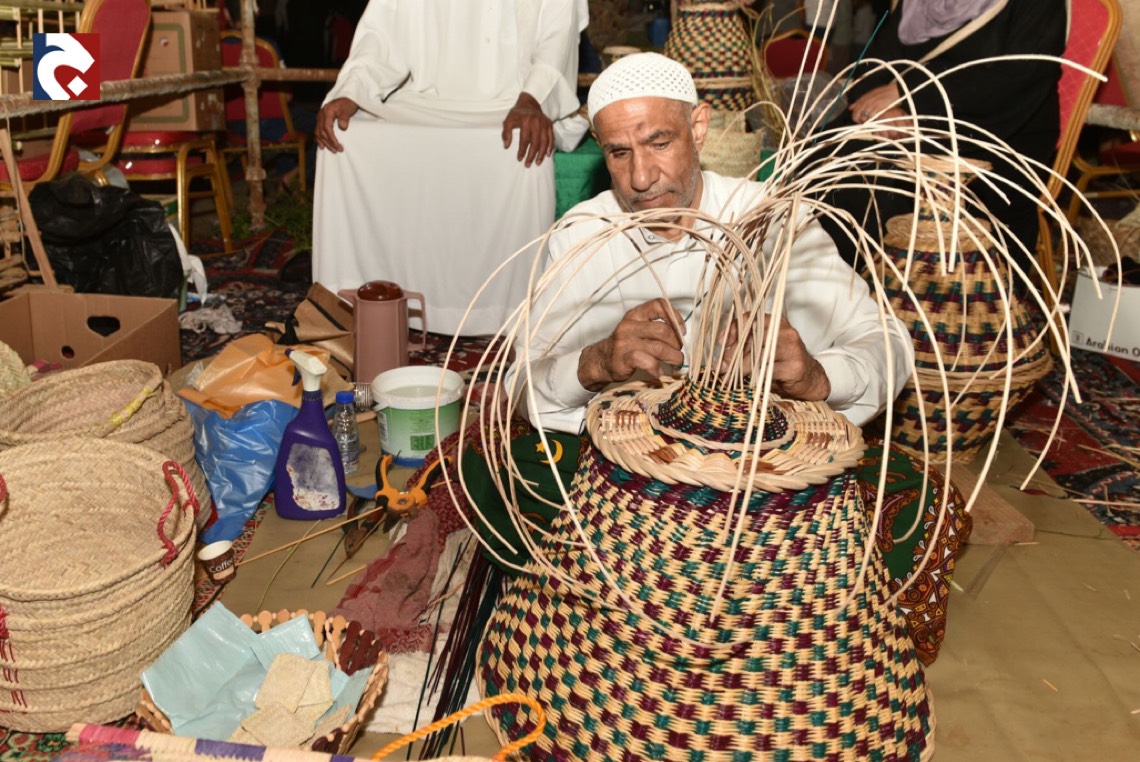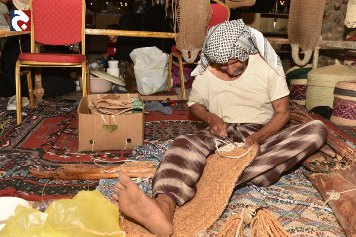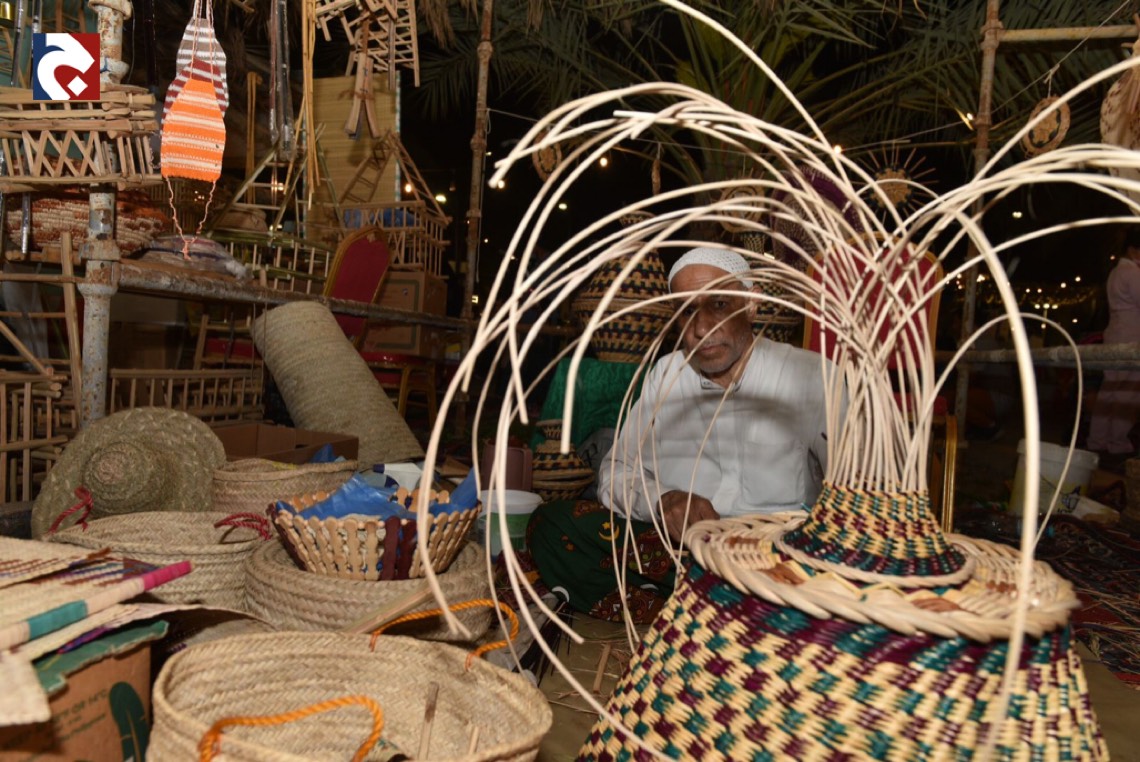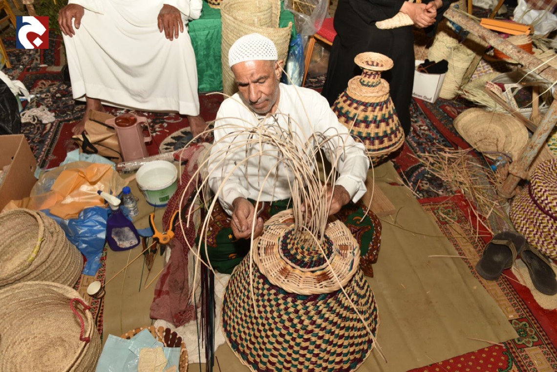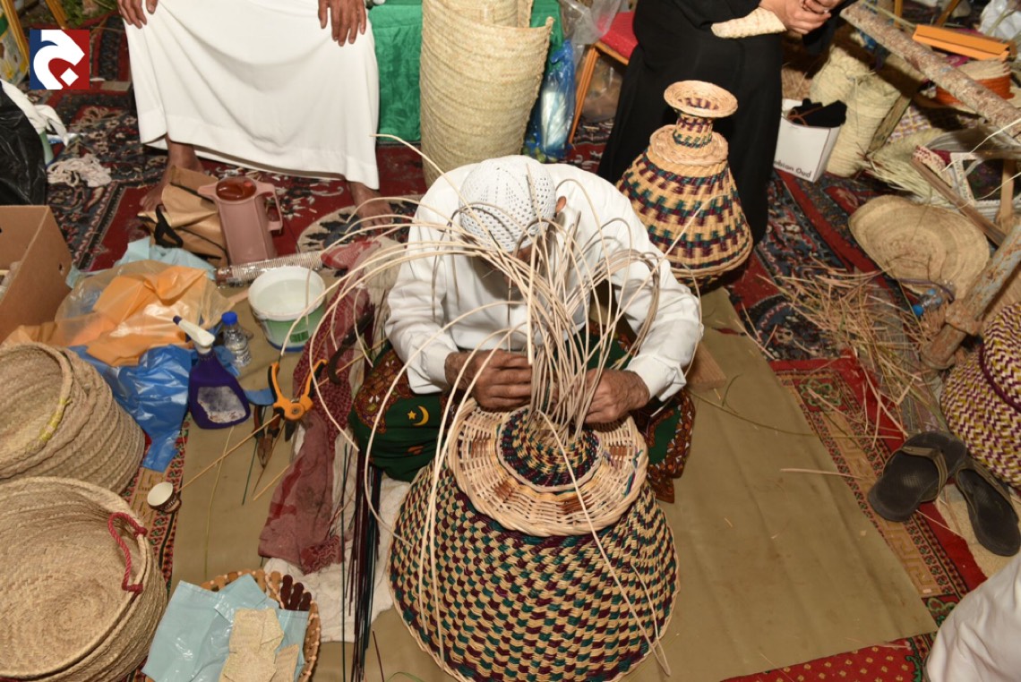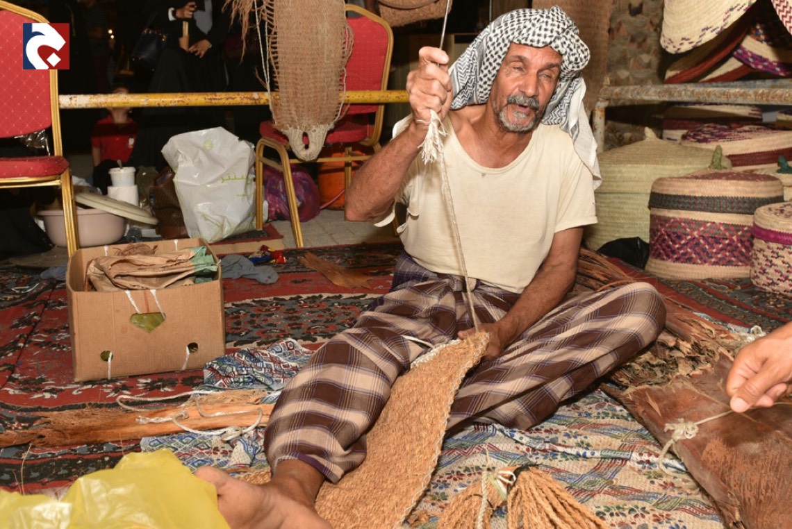 في أكثر من ركن ملتقى ”البراحة3”يجدُ الزائرون محطات ل“ سف خوص النخيل" في منظر جاذب يُدرب فيه الحرفيون الصغار عليها.