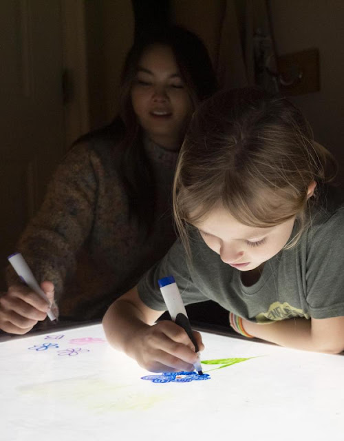 الصورة: طالبة الدكتوراه ساتشي وونغ Sachi Wong ترسم على منضدة ضوء مع طفل مشارك في الدراسة.