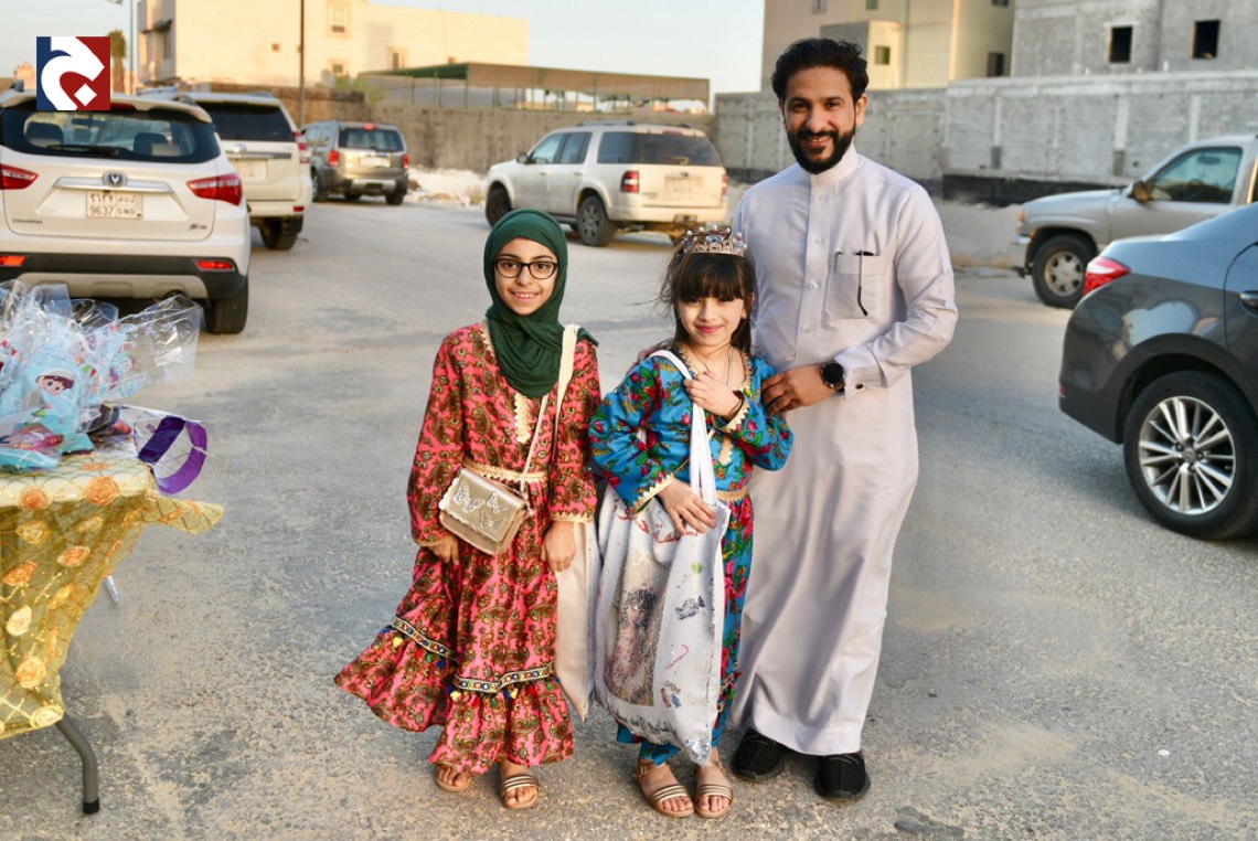 وانتشر الأطفال المتزينين بالثياب الخاصة بالقرقيعان وهم يحملون الأكياس مارين بمنازل الأقارب والجيران لجمع الهدايا والحلويات وهم يرددون بصوت مسموع ”ناصفة حلاوة اعطونا الله يعطيكم“.